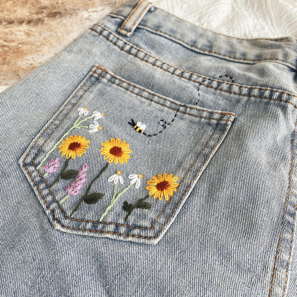 Denim Shorts Embroidered with Bees, Sunflowers & Daisies / Women’s Cottagecore Jeans Shorts / Unique Floral Embroidered Vintage Denim Shorts