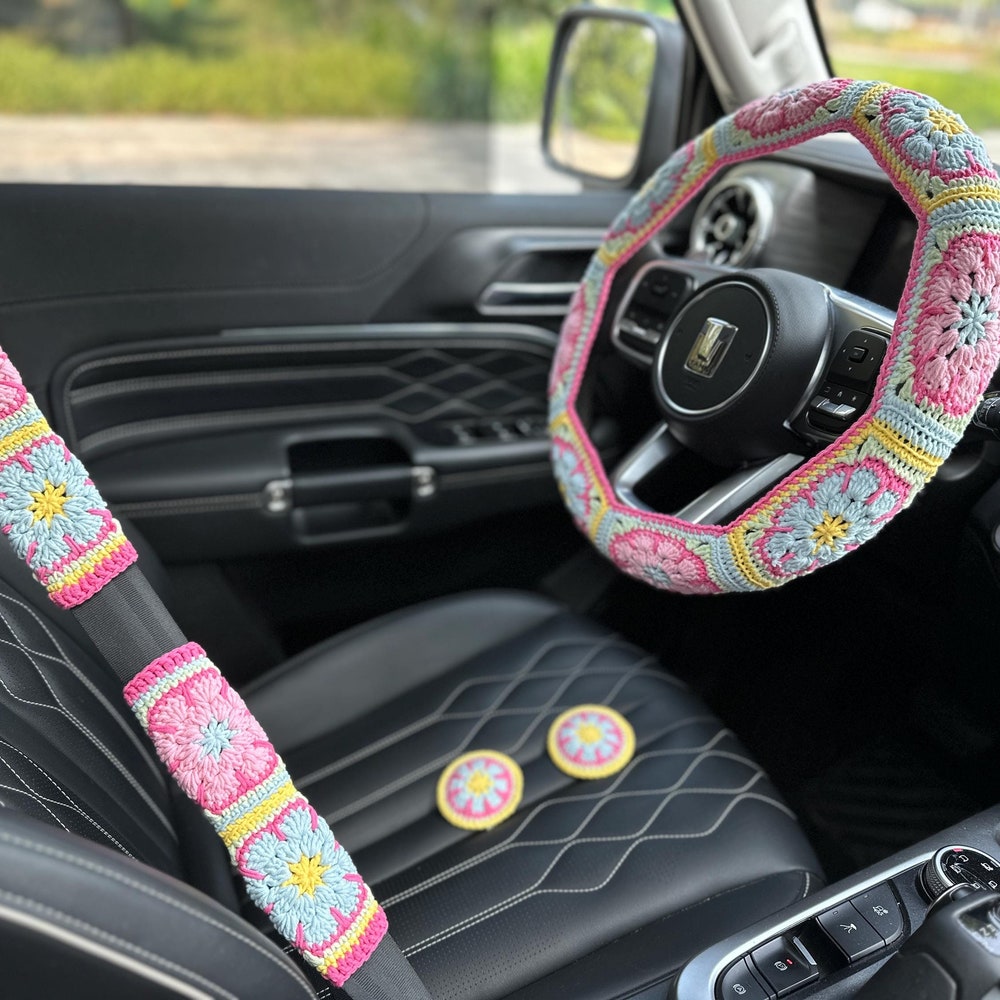 Handmade crochet Steering Wheel Cover for women, cute daisy colorful flower seat belt Cover, Car interior Accessories decorations